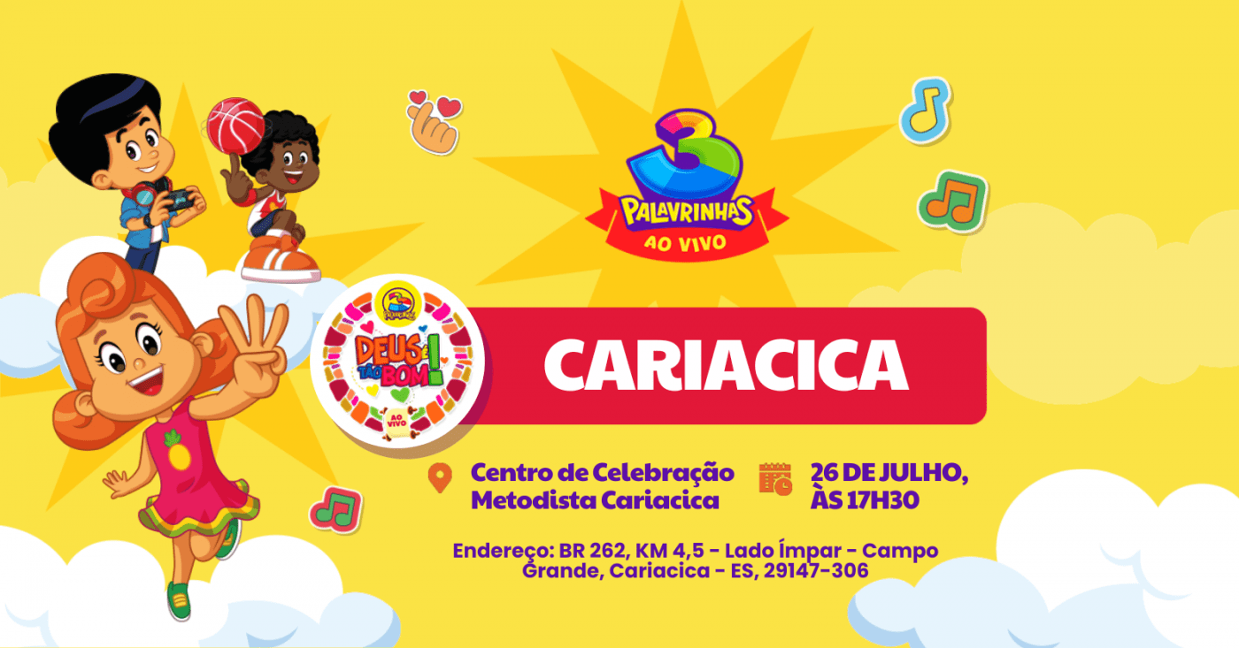 Sarah, Miguel, Davi e toda a trupe do 3 Palavrinhas desembarca no Espírito Santo, neste sábado (26), com o show “Deus é Tão Bom” no Centro de Celebração Metodista Cariacica, na Região Metropolitana da Grande Vitória, a partir das 17h30.