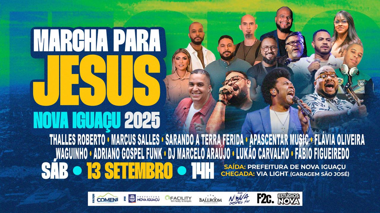Maior município da Baixada Fluminense, Nova Iguaçu vai receber a primeira edição da Marcha Para Jesus, que acontece no dia 13 de setembro (sábado), a partir das 14h, com concentração entre a Art Pão e a Praça dos Direitos Humanos. De lá, a multidão vai seguir até a Garagem São José, na Via Light, onde haverá um palco montado para receber grandes nomes da música gospel.